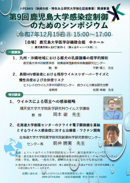 〒890-8580 鹿児島市郡元1-21-24 ヒトレトロウイルス学共同研究センター 〒890-8544 鹿児島市桜ヶ丘8-35-1 (鹿児島大学キャンパス) 〒860-0811 熊本市中央区本荘2-2-1 (熊本大学キャンパス)